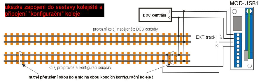 Aby takto automatická konfigurace byla i použitelná prakticky, byl vytvořen modul MOD-USB1, což se jednoduchý obvod, který zamontuje do sestavy kolejiště a umožňuje přepínat DCC signál na jednu vybranou kolej, která slouží jednak k běžnému provozu ale současně i ke automatické konfiguraci. Je splošný spoj s konektorem pro zasunutí DCC-prog a pomocnými obvody. Interním relé zajišťuje přepínání vybrané koleje mezi DCC signálem z hlavní DCC centrály a nebo během konfigurace pakety, generované USB modulem. Stav přepnutí relé je zobrazen pomocnou externi LED.