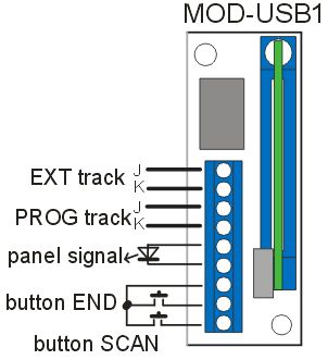 Modul MOD-USB1 není nutná věc, vše popsané výše lze realizovat i přímým spojením DCC-prog na extra kolej na stole. PC s konfiguračním SW je stále nutné, ponevadž SW provádí kromě scanování i poměrně dost výpočtů a kombinací pro nastavení CV, ale muže být někde v pozadí. Díky vložení MOD-USB1 do sestavy elektroinstalace kolejiště lze tyto procesy výrazně zjednodušit pro ovládaní dvěma tlačítky na panelu.